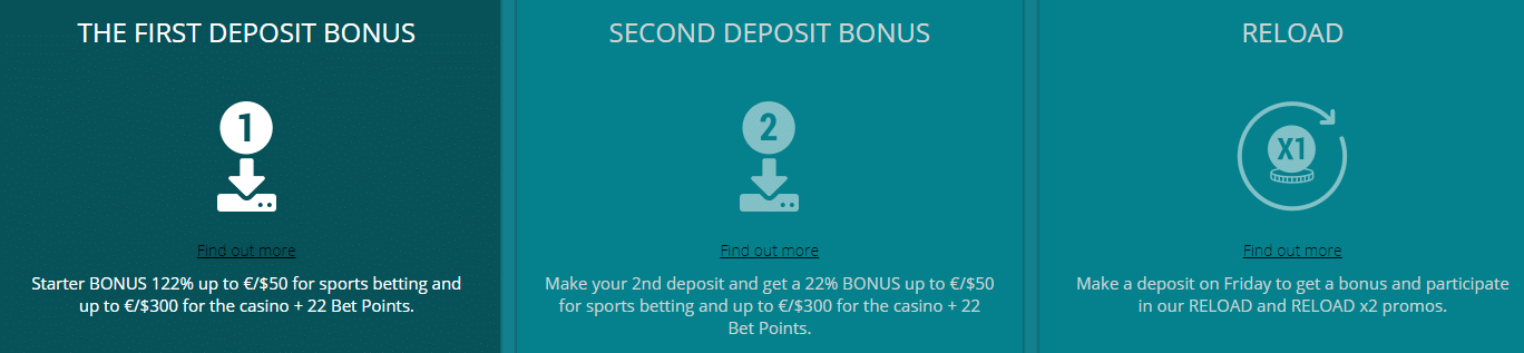 So wartet bei deiner Ersteinzahlung von mindestens 1 € und der Nutzung des 22MAX Promocodes von mindestens 1 € ein 122% Bonus bis zu 130 € für Sportwetten und ein 122% bis zu 300 € fürs Casino. Dazu erhältst du außerdem noch 22 BetPoints. Sobald du den Bonus umgesetzt hast, wartet bei deiner zweiten Einzahlung ein weiterer Bonus auf dich. Dieser beträgt 22% bis zu 50 € bei Sportwetten und 22% bis 300 € fürs Casino. Desweiteren warten 22 weitere BetPoints auf dich.